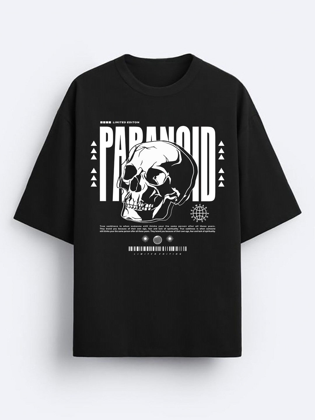 Introducing the "Paranoid Black - Premium Men's Oversized T-Shirt" by Fitsouls – a trendy and comfortable fashion choice. This oversized black tee combines comfort with a minimalist design, making it a versatile addition to your wardrobe, perfect for those who appreciate both fashion and simplicity.